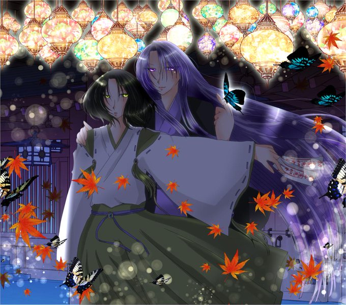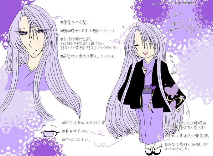 まずは六合さん。十二天将の一人で平和を司る蝶妖怪で鳩羽(4枚目の黒髪)に仕える前は彼の先祖に仕えていました。穏やかでいつもにっこりしていますが腹は黒いです。主ガチ勢で主の敵は私の敵タイプ。平和主義とは??? 前の主が呪い屋に呪い殺されたため内面は呪い屋への復讐心でいっぱいです。
