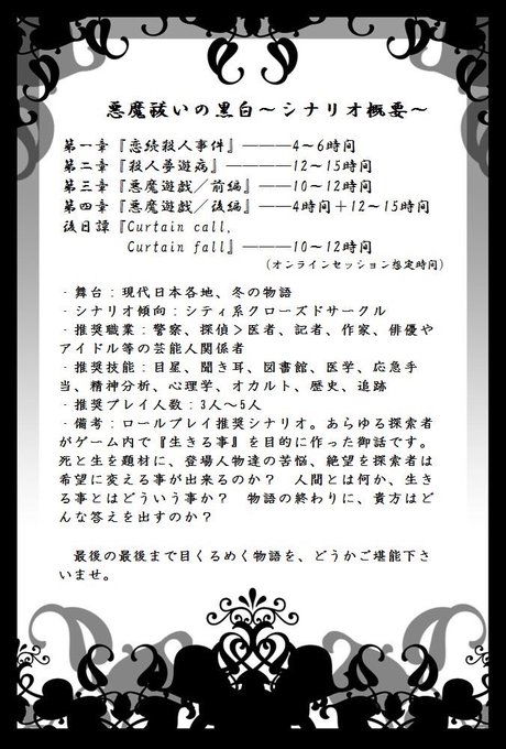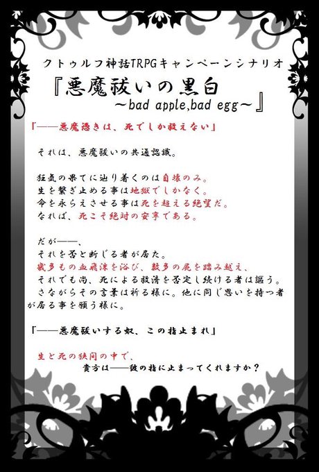 クトゥルフ神話TPPGキャンペーンシナリオ『悪魔祓いの黒白』。
