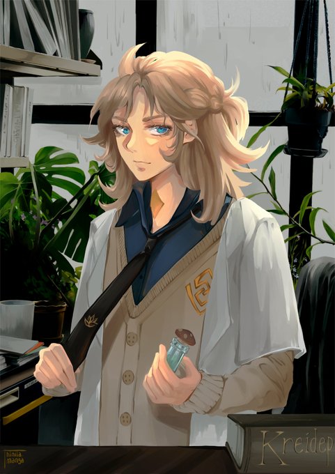 "Kraideprinz" fanart contest - I made #Albedo from #Genshinlmpact in his personal laboratory, making some potions on a rainy day. I have like 4 easter eggs in this art, can you spot them all?