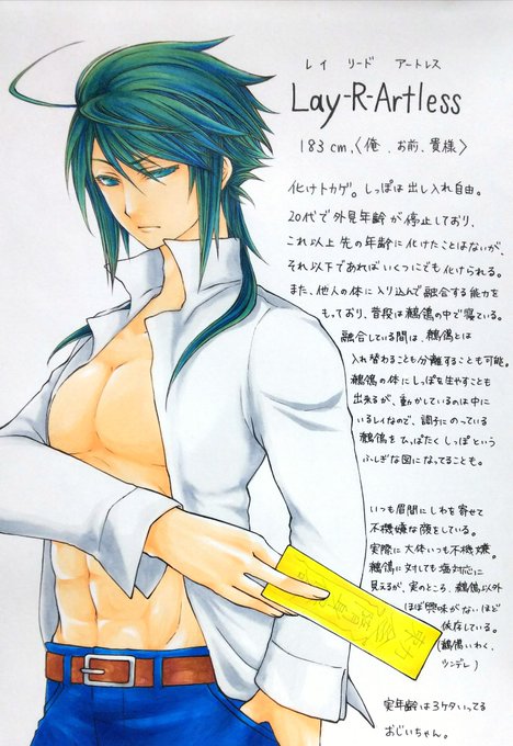 #創作夢ホテル #夢ホテル619 鶺鴒の保護者、化けトカゲのレイです。 分かりにくいですが、青っぽい緑色です。瞳は青緑。どちらもほぼ青に近い色味です。 前開きのシャツにダメージジーンズが多いですが、入れ替わった直後は鶺鴒の服を着ています。 難がある奴ですが、宜しくお願いします💦