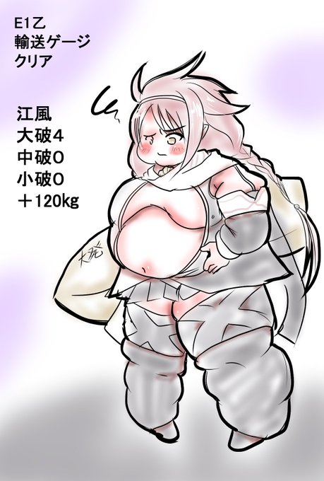 「なぁ・・・提督 クリアしたのはいいけど、この体どうなってンだよ・・・。」 被弾した分だけ肥やす体にしたからだよ。 江風、2019年冬E1乙輸送クリアおめでとう。