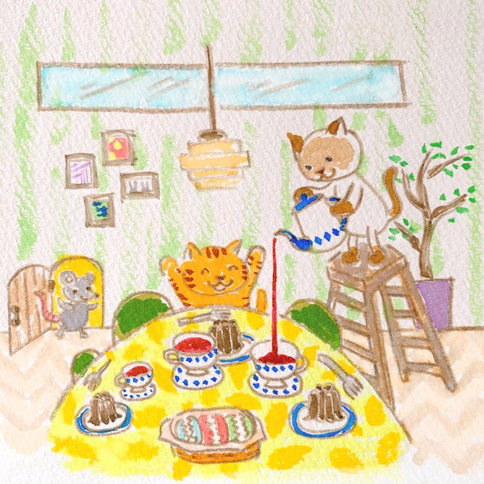 ほーら、こうちゃをいれるよ わあ、すごいね! なになに?ぼくもまぜてよー #イラスト #猫 #おえかき #ド直球に言いますがフォローしてください