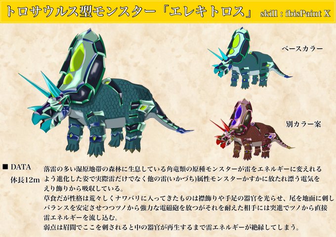 「エレキトロス」は以前描いた「トニトロサウテナ」のリメイクになります 以前はアンテナ要素をより落とし込もうとして情報量が多くなってしまいましたがシンプルめなデザインに変更、色もより敵キャラ感と電気を放つ戦車という感じを両立したカラーにしました
