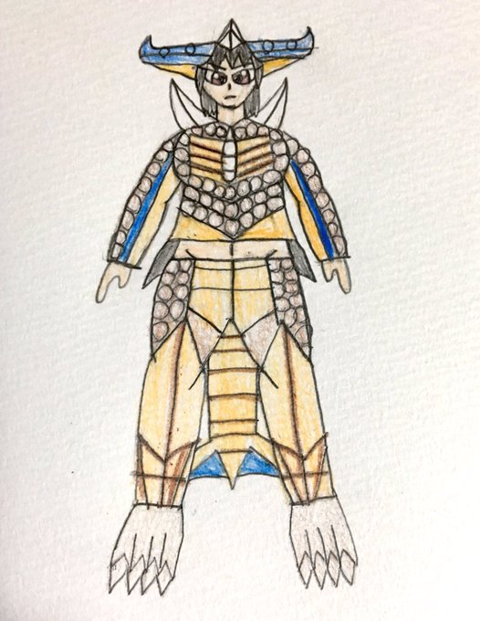 ディノゾールをかきました!その外見や頑丈な装甲、強力な光弾や舌などから怖がられることが多いですが友達を欲しがっている心優しいショタで毎日水素を吸収しています #怪獣擬人化