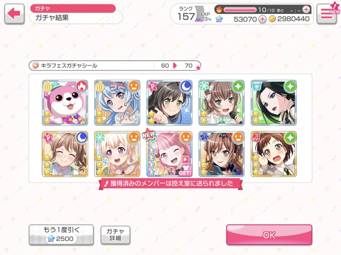 1枚撮り忘れたけど今回のピックアップ70連で揃った!!! 彩ちゃん大好きだよーーーー #ガルパ