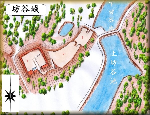 滋賀県甲賀市の坊谷城。 城主等、歴史については不明です。 上坊谷池、下坊谷池という2つの池の奥の丘陵地に築かれており、なかなかの要害地形です。