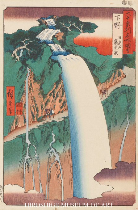 日光の裏見ノ滝。その名の通り、滝の裏側から流れ落ちる水を見ることができました。画中でも3人の旅人が岩壁を通る細道から滝を眺めています。水流は、透明感のある青のぼかしと、流れにあわせた空摺(凹凸加工)の線によって表現されています。見ているだけでマイナスイオンを感じる涼しげな一枚です。