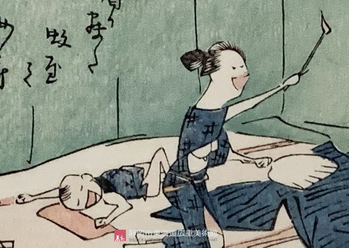 本図では乳飲み子を寝かしつけていた女性が蚊帳の中に入ってしまった蚊を追う姿が描かれています。広重は風景画以外にもこのような戯画も多く描いています。