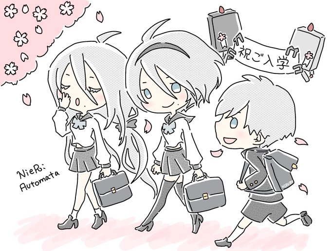 桜の季節が近くなってきたので、入学式アンドロイド3人組と桜2B9Sを置いておきます😌 #NieR #ニーアオートマタ