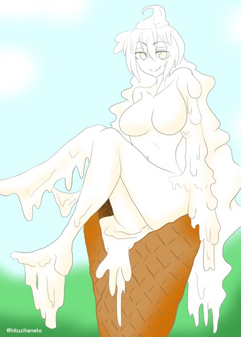 #スライム娘版深夜の真剣お絵描き60分一本勝負 お題:【材質】「アイスクリーム」 サクサクワッフルコーンのバニラアイスライム娘ちゃん!