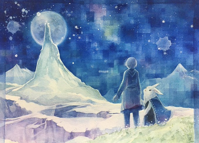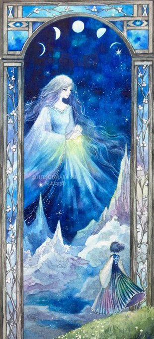 遠い世界の夜空、妖精や神様たちを透明水彩で描いています。