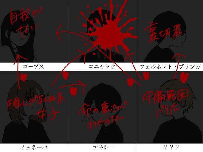 組織主描いてたら4時間もかかったんだけどそんなに時間かけといてこれかよって感じ 3枚目の矢印はクロスオーバー時空(諸説あり) ひとりだけ毛色が違うやついるの草
