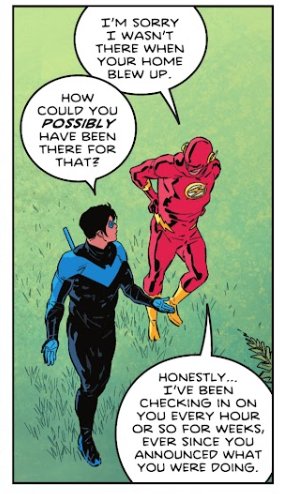 Coming back into DC to find out Nightwing is canonically bi, his friends are coming to Blüdheaven, Wally keeps tabs on him every freaking hour AND he has a cute dog now...