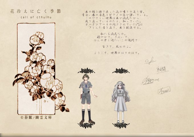 CoC「花冷えに亡く季節」 KP:すうさん HO記:けいさん(カノン) HO花:はなこ(ナカレ) エンド2にて終了です、お疲れさまです。 最高のKPさんと相方さんとともに花冷え通過させてもらいました。 あたたかくてやさしくて素敵な物語をありがとうございました🥀