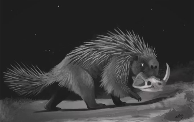 Another prehistoric creature I have never seen drawings of, the giant Miocene porcupine Neosteiromys from South America! It was largely terrestrial and in the same size range as living African porcupine! Here seen carrying a nice skull to gnaw on for dental health and minerals :B
