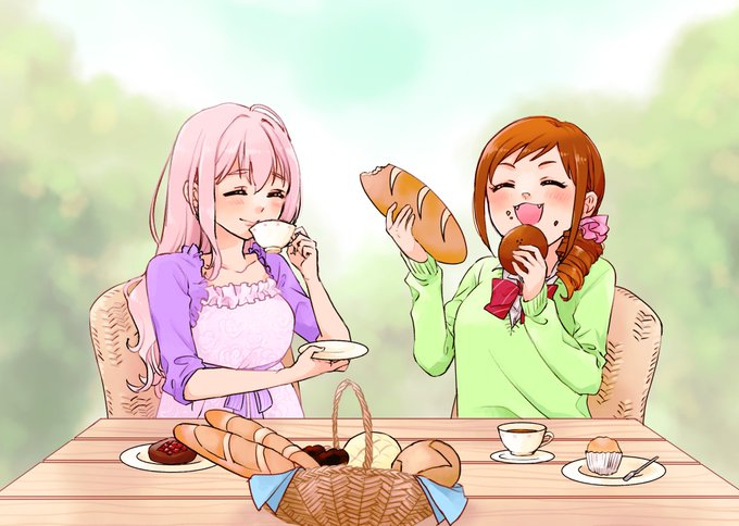 ボイスオーディションの時に描いてたやつ3枚目 パンまみれパーティーしてる琴歌お嬢様とみちるちゃん 小物が……描けない #西園寺琴歌 #大原みちる