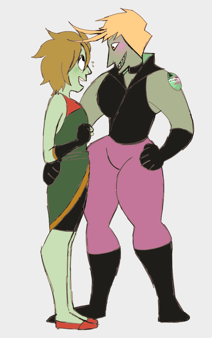 otegem (bloodstone) with dougem (zircon) ( design by @musclehell ) and their fusion, otetanu! (who is a beryl) : D