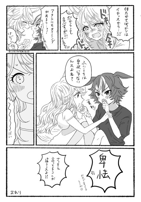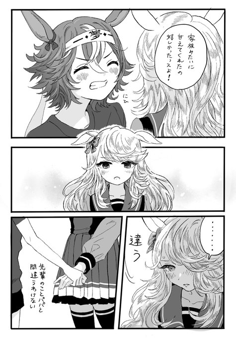 ② 「わちゃわちゃ」してるページはご想像におまかせしますが、次のページで先輩がほっぺに手を当ててる、ってことです。