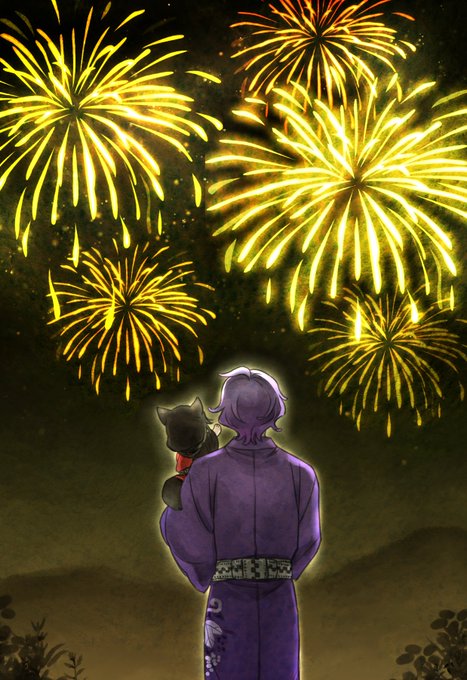 仲良く軽装で花火を観る歌仙さんと兼わん(犬化した兼さん)