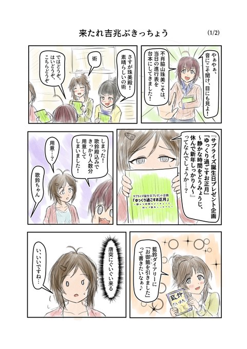 『来たれ吉兆ぶきっちょう(P2)』 シンデレラガールズ劇場わいど☆ 第344話より。 粗相と煩悩とぐいぐい。 https://t.co/t1JMNh8Kjf #シンデレラガールズ #デレマス #デレステ #道明寺歌鈴 #高森藍子 #脇山珠美 #浜口あやめ