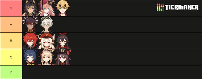 烈開花編成でおすすめな炎キャラって下図のように考えてるけどどうなんだろうな。下に行くほど手間や熟知以外の要求が大きくなっていくかんじで。 特にディシアと煙緋は快適ってか楽に烈開花できて気持ちいい。 #原神