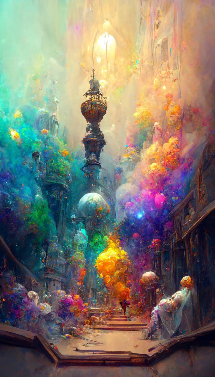 虹色の街へようこそ。楽しいことがいっぱいあるから期待していい。ただし黒い煙にだけは近づいてはならないよ。触れた者はどこかへ消えてしまうという噂だ。 #midjouney #縦長画像