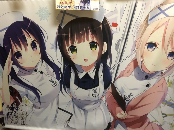 @X7ot6rcuybA5ysR 各描きおろしにはうさぎの装飾やマークがあったり、女子力を気をつけた部分(ブラが透けないよう下に一枚着てる白ワンピココア、風呂で髪を丸めてるチノなど)、髪をお揃いにしたテーマイラスト、などがあるのもごちうさの特徴ですね