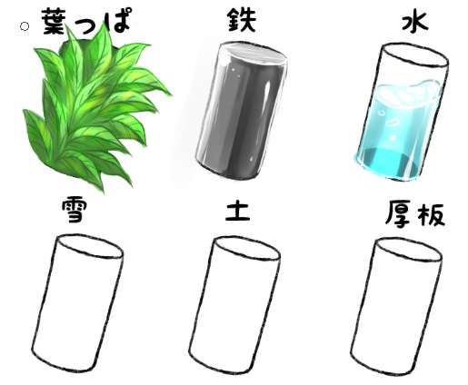かぴ様からマテリアルの描き方勉強用紙をお借りして最初の3つを塗ってみた。