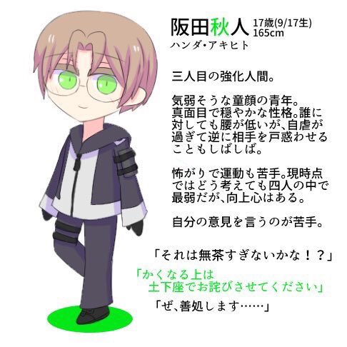 蕪木二郎:特務機関の職員で強化人間達の世話役。32歳独身。真面目で硬い雰囲気の中間管理職で、自由な上司と当たりのキツイ部下に挟まれ日々ストレスを溜めている。元は前線で戦う兵士だったが、怪我を機に内勤に転属した。喫煙者。「全ての要望を叶えられるとは言えないが、可能な限りは善処しよう」