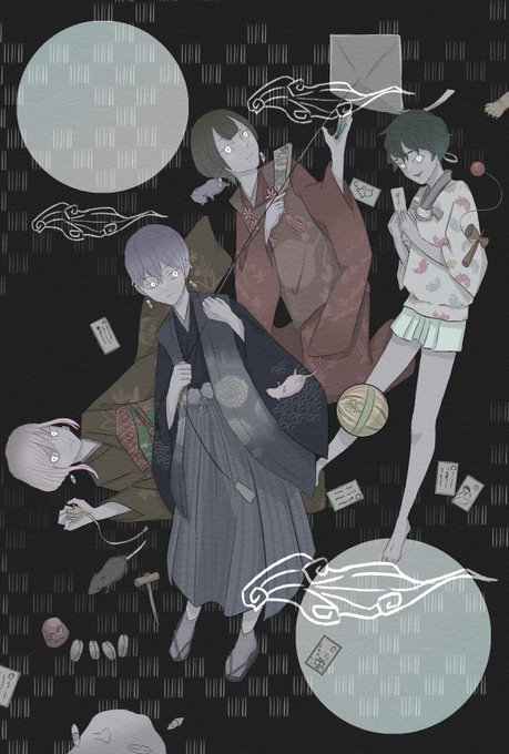 創作の世界線が全部違うのは珍しい気がします。1枚目が妖怪が出てくる創作で、2枚目が寂社、3枚目が死者、4枚目が黄泉の創作です。