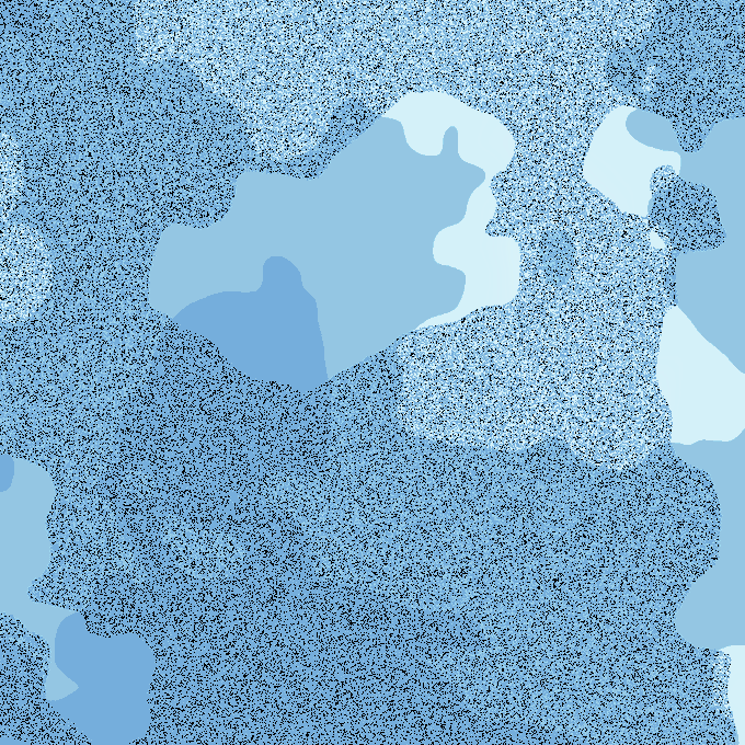 An experiment mapping x, y noise values to palette array indices (and adding a layer of black pixel gradient similarly). By controlling the noise increment, you can essentially zoom in or out, and images are simpler or wilder. #genart