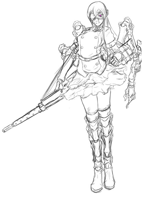 お昼の過去絵上げ、SF世界の住人。「Alkeny」アルケニー、四本の義体腕が特徴の機体。高いステルス能力と運動性能を持つ。姉のアラクネとは対照的に近接格闘に特化したフレームを装備しており、強襲やかく乱を得意としている。姉に「Arachne(アラクネ)」が居る。