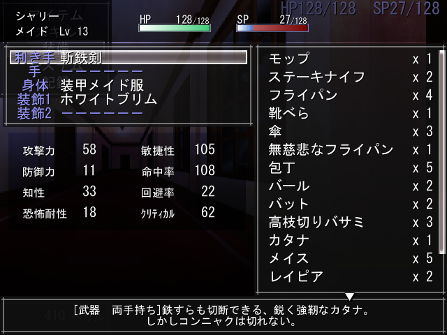 メイドインザフィアーがノンフィールドRPGということで面白そうだったので遊んでみてました。斬鉄剣で敵をバッサバッサなぎ倒す姿にRuinaのフランちゃんを思い出したよ。ランダム要素もあることだし、もう一人のメイドちゃんや、もう一段階上の難易度も挑戦してみたいところ。