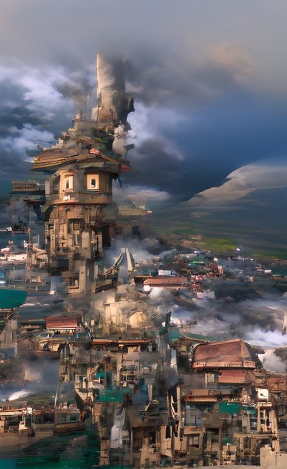 AIに描いてもらった FF7シリーズ(?) ゴールドソーサー 空から見たミッドガル ニブルヘイム 思ってたんと違うのばっかりだけどかっこいい。風景は得意みたいだけど、生き物は苦手みたいだね。 #wombodream