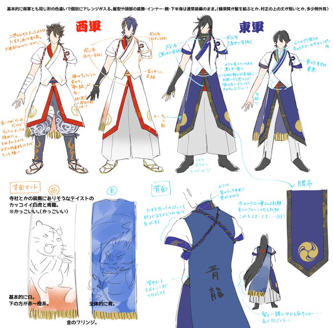 これはベッターに上げてた衣装まとめ4人分!陸奥の腰布はもうちょい長かった、上の丈はたぶん全体的にもう少し短かった、そして三日月の袴の模様忘れてた……🤔