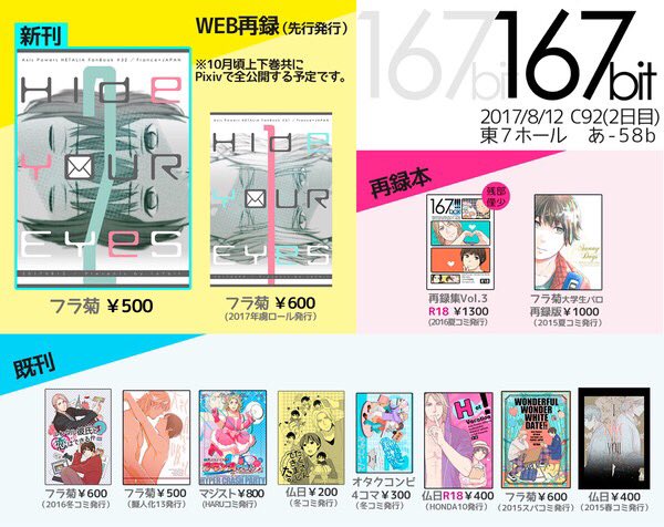 8月12日(土)コミックマーケット2日目 東7ホール あ-58b【167bit】 新刊は続き物の2巻(完結巻)です。 【HideYourEyes(2)】 B5/36P/500円 よろしくお願いしまーす!
