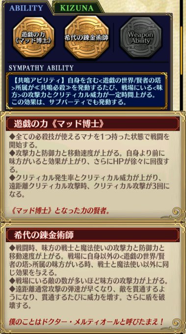 遊戯の世界《マッド博士》メルティオールは、4部仕様の魔武器、遊戯所属、バトル所属:賢者の自己強化型の魔法使い。 0マナ必殺技、クリ時3回攻撃、貫通、盾破壊、敵数依存全体バフ、共鳴アビは全体バフ、緩い条件付き無条件結束。 遠距離謀略リヴェラ。 SDが、本当はこういう生き方が? #チェンクロ