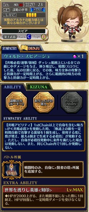 遊戯の世界《マスコット》バルクスは、4部仕様の斬武器、遊戯所属、バトル所属:魔神の自己強化型の騎士。 単体無敵、吸魂、盾破壊、絆が盾破壊、クリ時範囲攻撃、近接キャラのWAVE UP、緩い条件付き無条件結束。 特攻とデバフ抜きならフーコより火力は上。 魔神は見た目が10割。 #チェンクロ