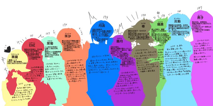 #福々創作袋 色々キャラクターが増えた怨霊退治シリーズの身長表。 二枚目が名前と現状説明とまとめ