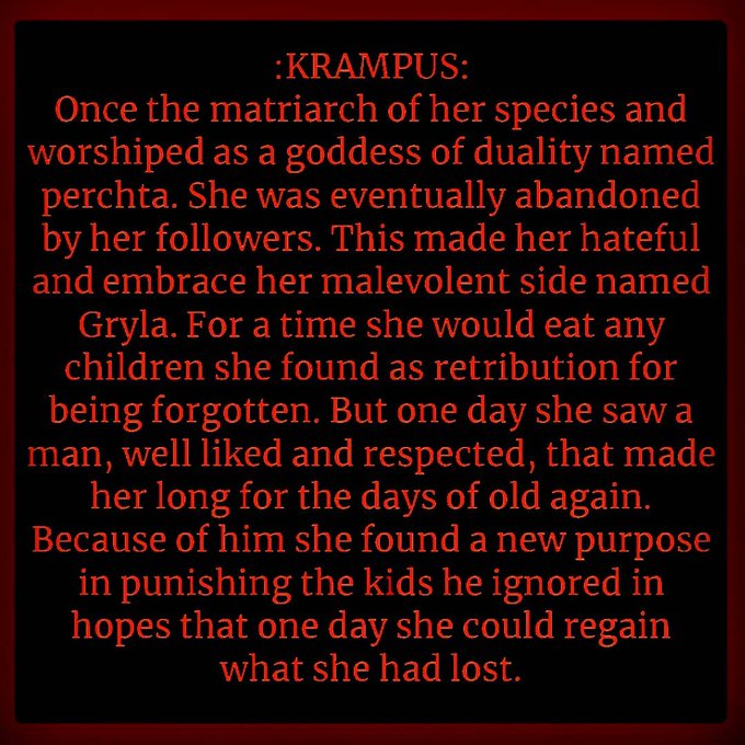 Yo! This is my take on Krampus with my own lore for the entity utilizing several similar folklore beings I did around Christmas time.