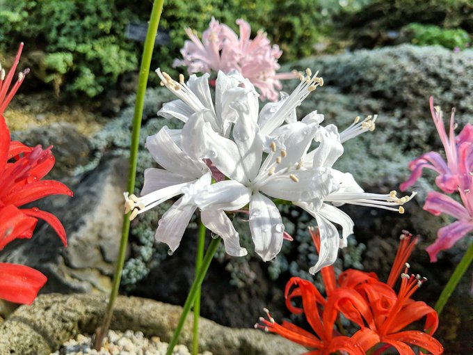 ネリネちゃん!たまに彼岸花さんに間違えられる娘だね!植物園でも来場者さんに間違えられてたよ!可憐な花が特徴的で、光が当たることでキラキラ光るダイヤモンドリリーなんかが有名かな?勿論家でも楽しめるけど、球根なら一年は確実に掛かるから、鉢植えを買おうね!