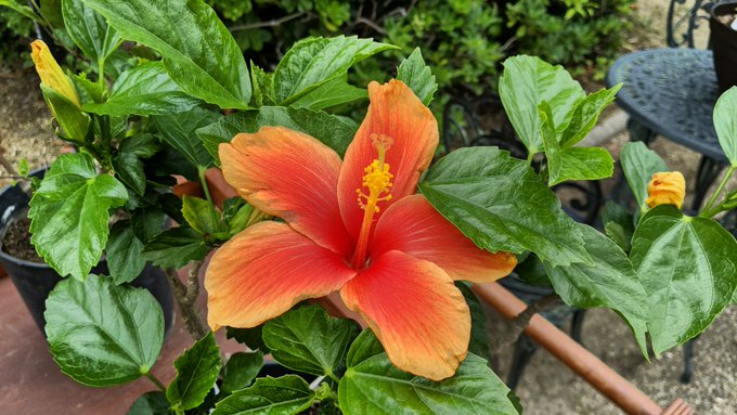 ハイビスカスちゃん!非常に鮮やかな花と大輪の花が特徴的な娘だね!南国の植物で、日本だと初夏から終夏まで咲くよ!本州だと鉢物が一般的だけど、沖縄とかの暖かい地域だと庭などにも植えられているみたいだね!育てるのが大変で、熱中するあまり沼に落ちる人もおおいとか。
