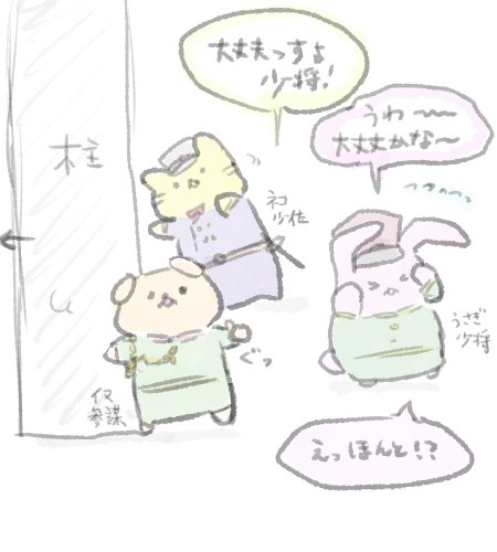 自分のイメージをどう描いていいのか全く分からず、小学生からの二つ名に「大佐」って入ってる事だけから連想して筆の向くまま描いたら見たことも描いたことのないものが出来ました。うさぎの癖にちゃんとサーベルを差している。