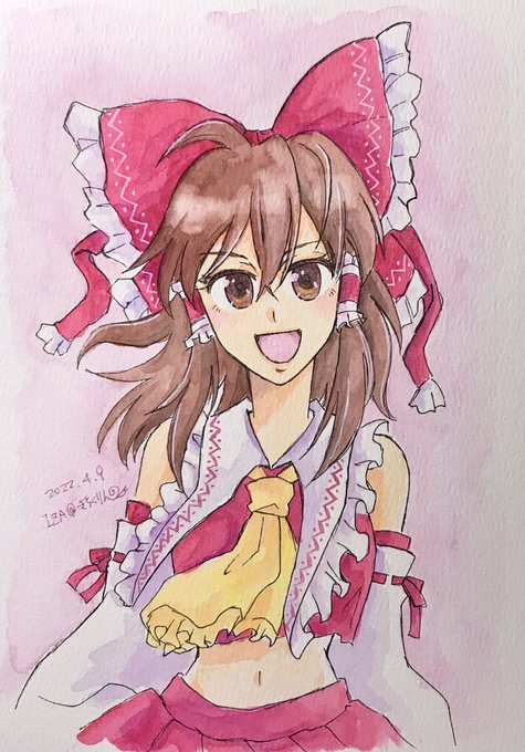 ウリである発色の良さを実感したくて、えいやっ!といつもより強めにほぼベタ塗り。 どうだろうか…明日また違う紙でも試してみよう。 キャラはなんとなく思い付いた霊夢さん。 #イラスト #試し塗り #まっち水彩