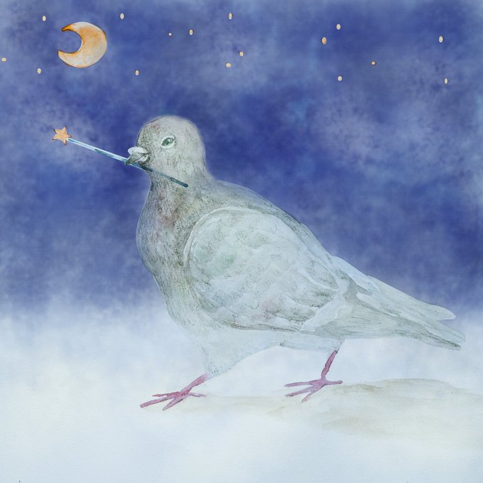真夜中の鳩 水筆を買ったので、水彩で鳩等描いて背景をPCで加工。水筆楽しい。 #イラスト #鳩 #水彩画 #水彩 #illustration