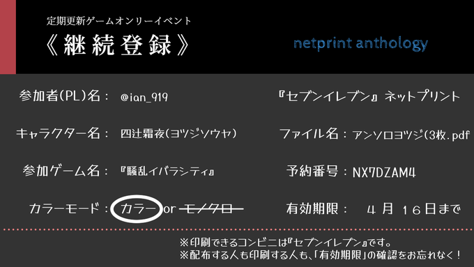 注意!『片面』印刷用です。 『騒乱イバラシティ』ENo.1231四辻霜夜のネットプリントです。カラーで『片面』印刷用に3枚となっています。内容はサンプル通りですが、テスト印刷は行っていません。 #継続登録ネットプリントアンソロ