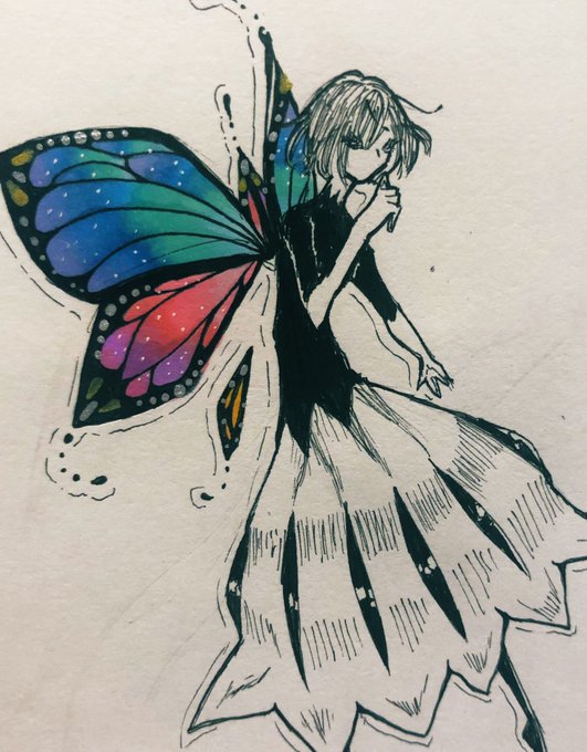 蝶々書きました。 顔はあんまし気に入ってないけど胴の長さは気に入ってる! コピック久しぶりすぎてちょっと汚いけど綺麗な色なハズ