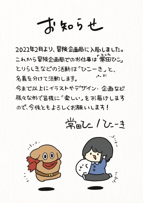 【お知らせ】 2022年2月より冒険企画局に入局しました。 これから「常田ひこ」名義での活動も頑張っていきます。 (読み方は「とこた・ひこ」です。とことこ。) 今後ともよろしくお願いします。