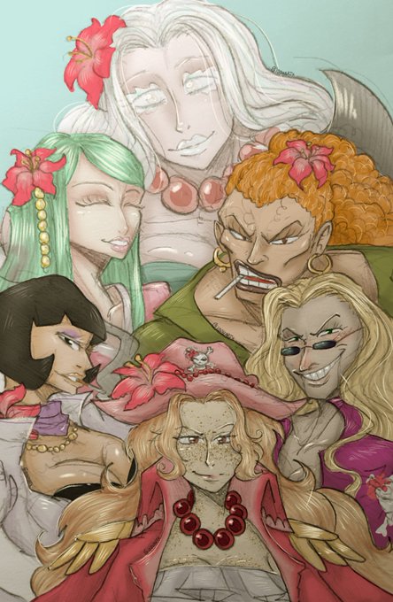 ⚠️ all this is NOT canon. But I liked the idea so I have to draw and give some sort of story to this crew even though I know very well that none of these characters interact with each other in the cannon story! The white-haired woman is my oc