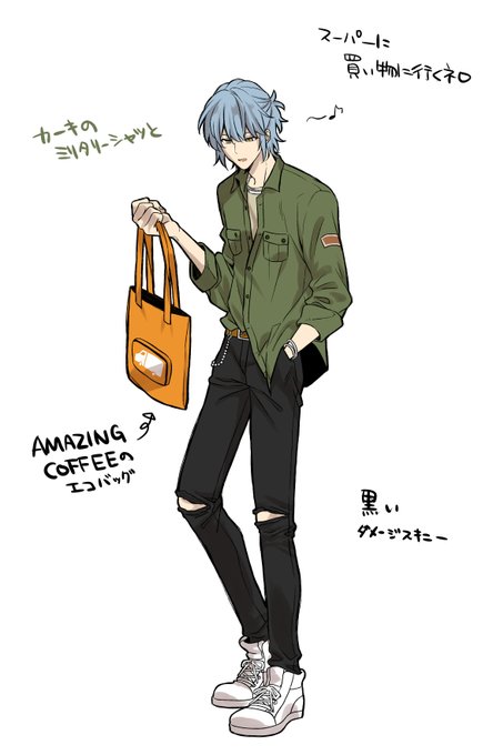 ミリタリーシャツと黒いダメージスキニーのネロとブとお忍びデートのネロ(イメージ)